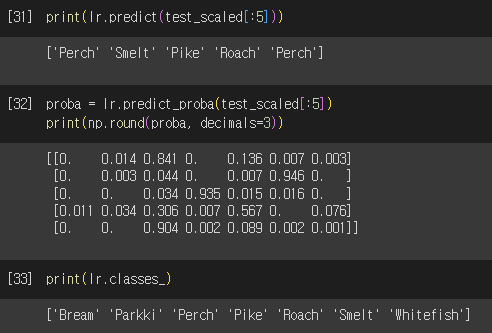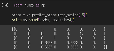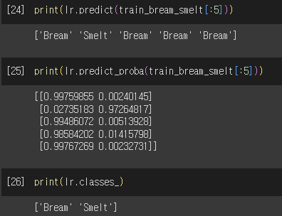 - predict_proba() : 클래스별 확률값 반환(출력순서는 classes_속성 순서와 동일)
