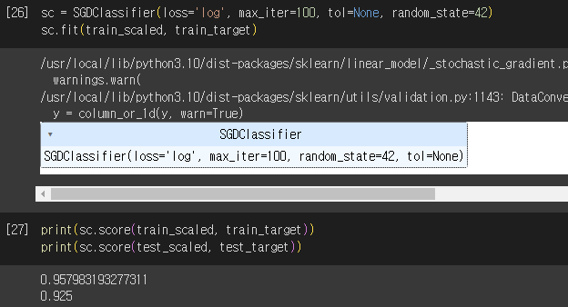 - partial_fit() : 모델을 이어서 훈련할 때 사용, 호출 시 1에포크씩 이어서 훈련할 수 있음